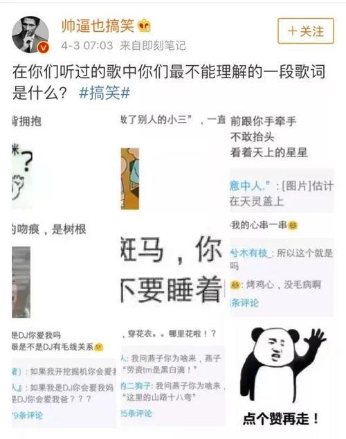 微博,这个充满活力的社交平台,不仅是明星们展示自己的舞台,更是搞笑歌词的聚集地。在这里,网友们用幽默的歌词,记录下生活的点点滴滴,让人在欢笑中感受到生活的美好。